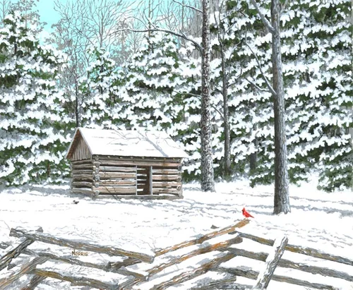 When the snow is deep enough the scene is completely dominated by a pure white blanket that covers everything. The addition of a single red-feathered cardinal really brings the scene to life. Footprints of mountain critters can’t be ignored and are fun to add in these paintings.
